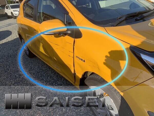 アクアの側面事故の修理をご依頼頂きました。板金塗装にて修理します。福岡市 中央区のH様