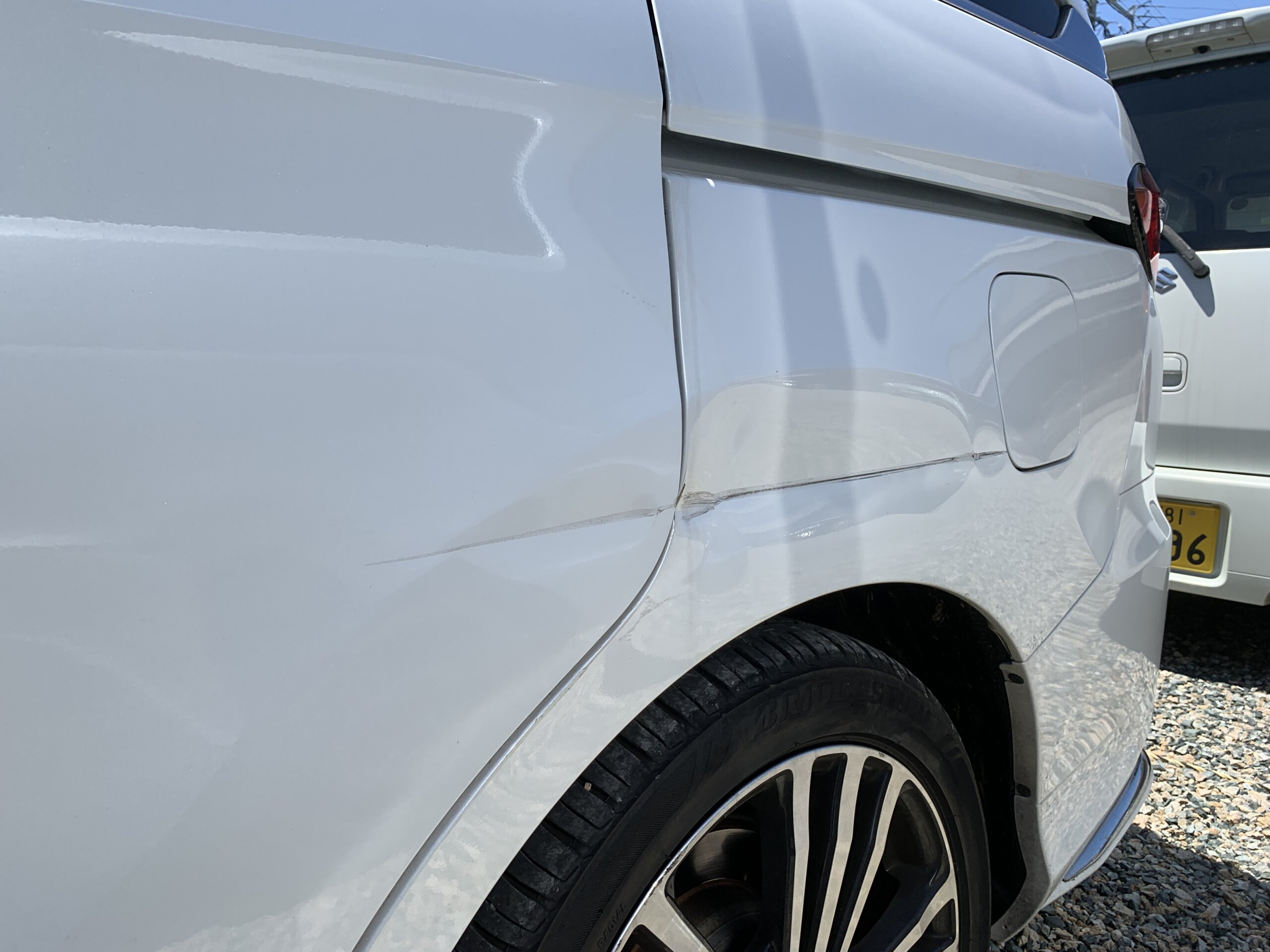 完成の写真で申し訳ありません。 (施工前に写真を撮るのを忘れておりました...)] ガードレールに干渉して出来たヘコミと、キズの修...